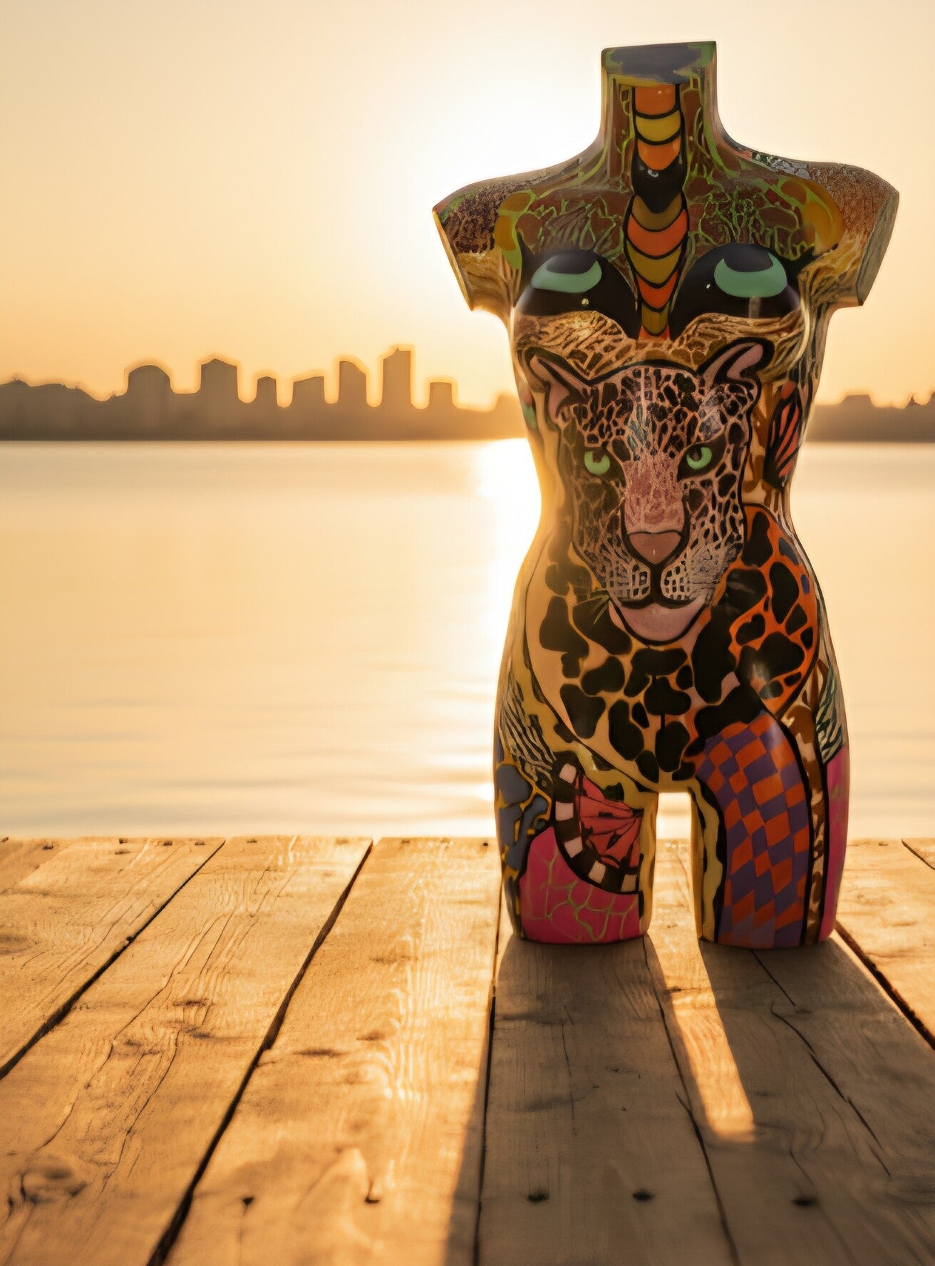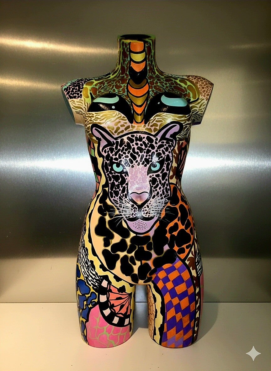 Deze handbeschilderde paspop belichaamt instinct, vrouwelijkheid en innerlijke kracht. Centraal staat het luipaard: een symbool van scherpte, vrijheid en zelfvertrouwen. De blik is recht en onverschrokken, alsof het werk de toeschouwer uitnodigt om eigen kracht te herkennen en te omarmen.